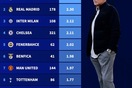 [流言板]穆帅执教各队场均得分榜:波尔图2.32分居首;皇马2.3分第二